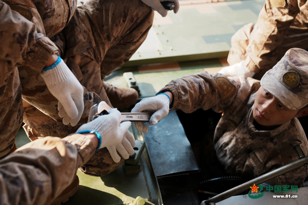 “梁山战斗英雄连”官兵修理维护战车。中国军网记者孙智英摄