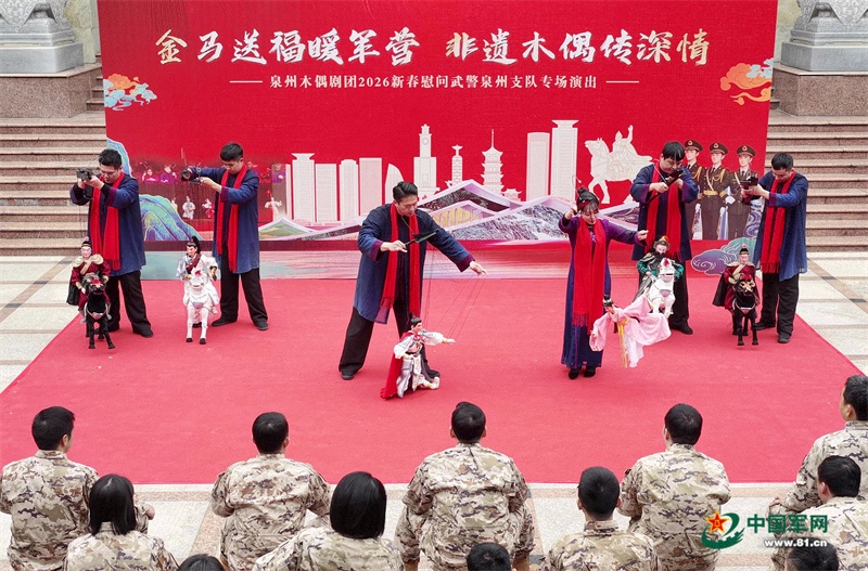 福建泉州提线木偶戏,古称“悬丝傀儡”,传承千年,至今保存700余出传统剧目和300余支曲牌唱腔,是中国悬丝傀儡艺术的珍稀范本。泉州木偶剧团将跨越千年的非遗“文化年货”——提线木偶戏送进武警泉州支队,为官兵带来别样的新春祝福,用丝线“提起”的一出好戏连接起传统的“年”、军营的“情”与传承的“根”。