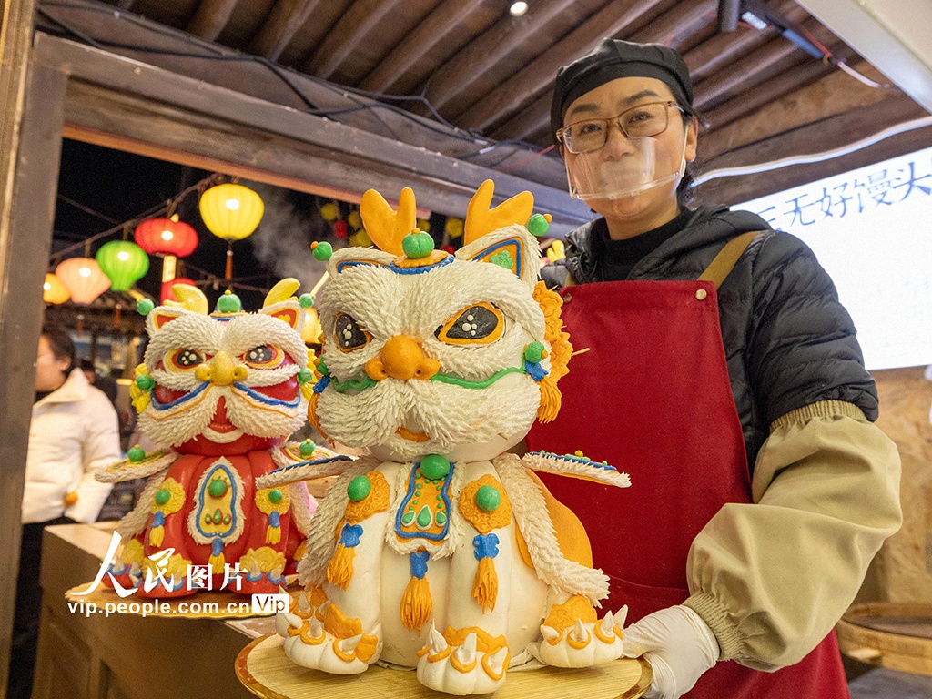 2026年2月10日,在河南焦作山阳区恩州驿古街的花馍工坊内,工人正在展示制作完成的花馍。贾蓝摄(人民图片网)