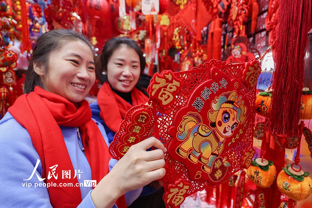 农历马年春节将至,北京各大商场的年货饰品琳琅满目,红灯笼、春联、福字及马年主题装饰汇集一堂,市民纷纷选购,点燃节前消费热潮。陈晓根摄(人民图片网)