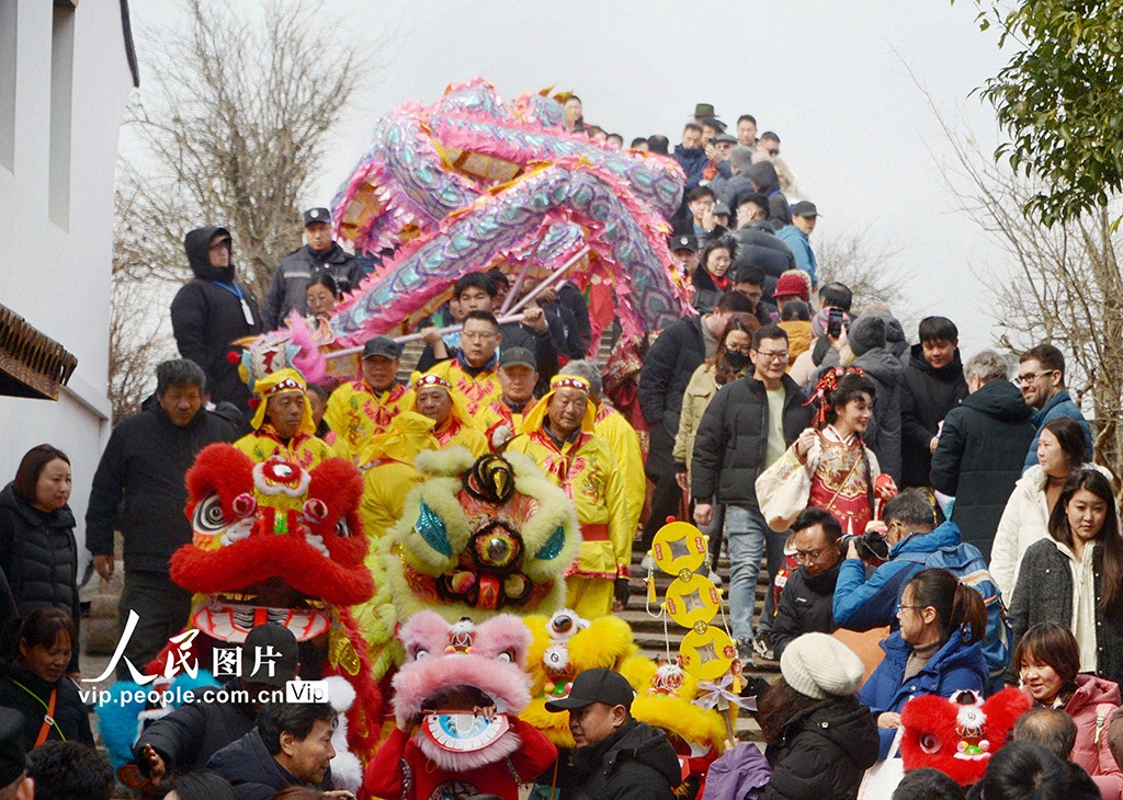 2026年2月10日,四川南充周子古镇暖意融融,返乡游子与乡亲欢聚一堂,观看舞狮表演,共迎新春。由当地居民自发组织的35桌“团年宴”热闹开席,大家品尝家乡味,畅叙邻里情。李向雨摄(人民图片网)