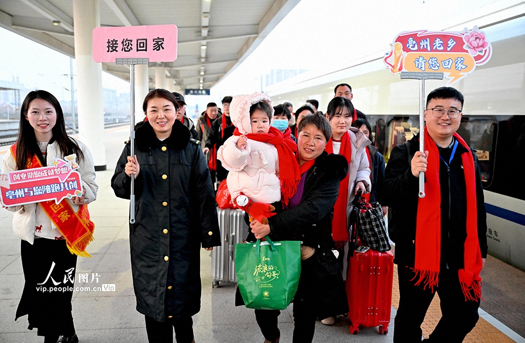 2026年2月10日,安徽省亳州市人力资源和社会保障局、亳州市邮政分公司联合开展“春运邮情 情暖江淮”接您回家公益活动,免费接送在上海务工的亳州籍人员返乡过年,并向他们发放新春暖心礼包。刘勤利摄(人民图片网)
