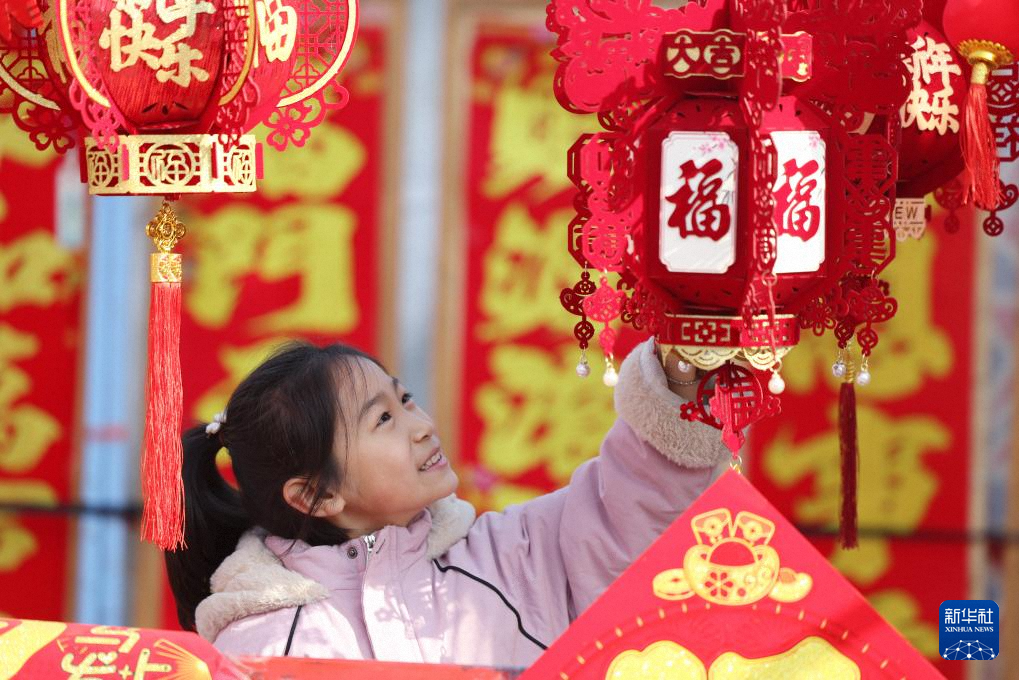 2月13日,在山东省临沂市郯城县郯城街道年货市场,小朋友在选购春节饰品。新华社发(张春雷摄)