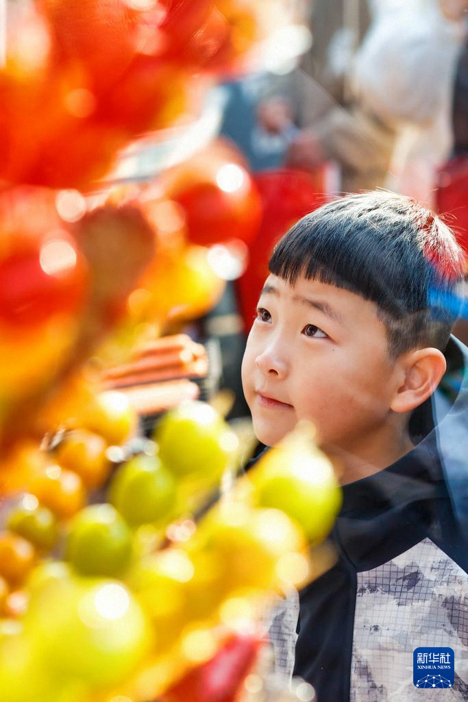2月10日,小朋友在天津芦台大集上购买冰糖葫芦。新华社发(杜鹏辉摄)