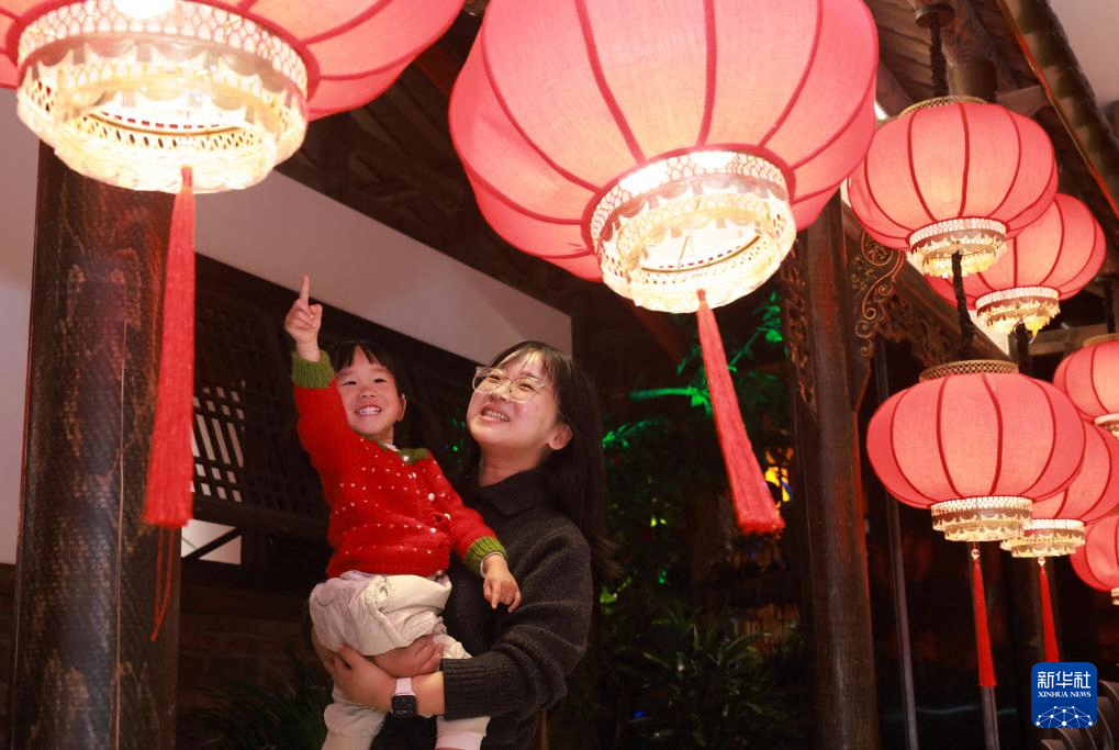 2月14日晚,游客在四川省成都市武侯祠赏灯。新华社发(李向雨 摄)