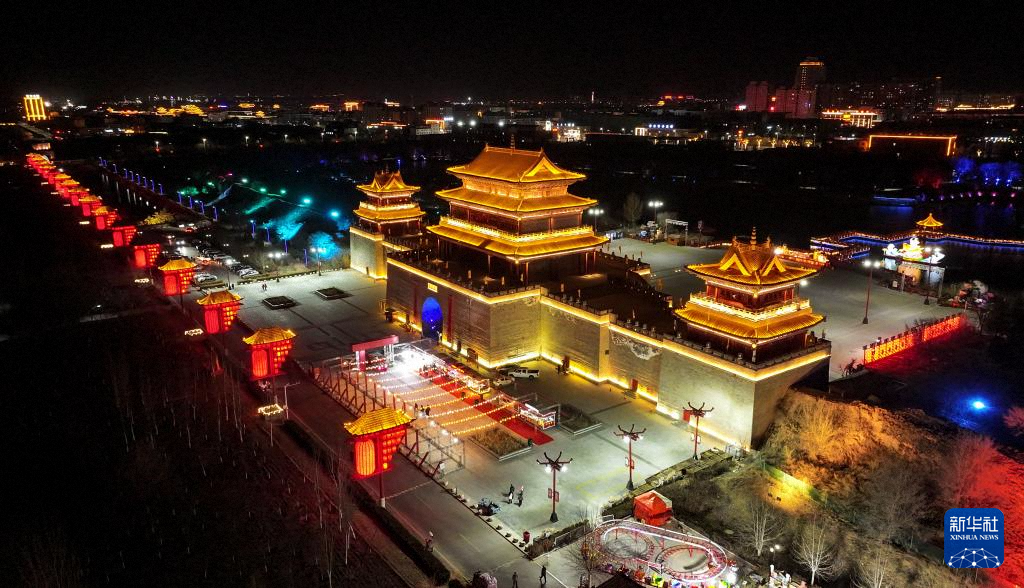 这是2月18日拍摄的宁夏盐池县九曲民俗文化园和长城关夜景(无人机照片)。新华社记者 冯开华 摄