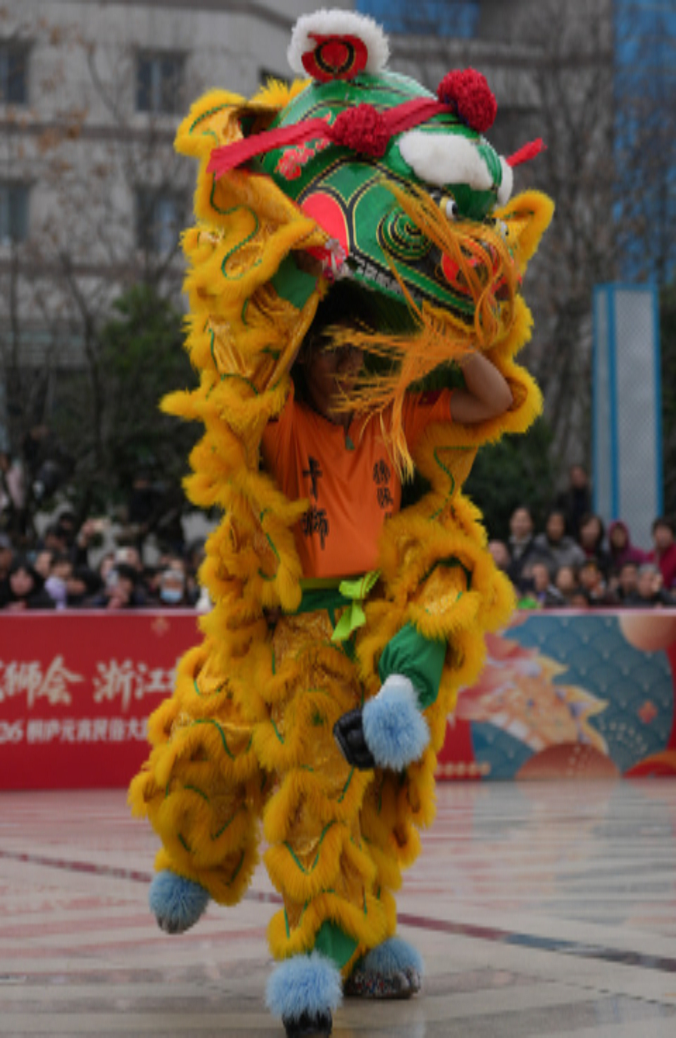 2月28日,广东揭阳青狮表演队在桐庐县中心广场巡游表演。