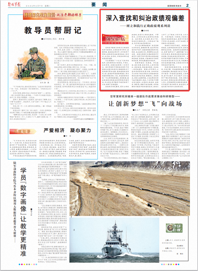 某部在开展树立和践行正确政绩观学习教育时,注重抓好学习研讨、查摆问题、整改整治等环节,引导党员干部深入查找和纠治政绩观偏差,务实功、出实招、求实效,不断推动部队建设高质量发展。