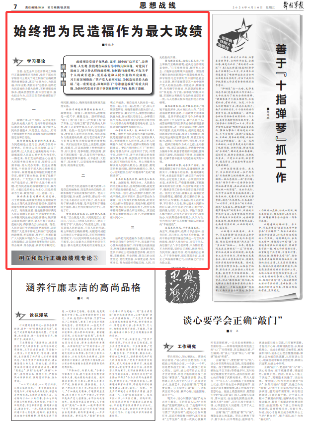 始终把为民造福作为最大政绩,这种坚定自觉不会凭空产生,而是源于初心使命的感召践行、科学理论的浸润滋养、躬身实践的磨砺锻造。奋进新征程,党员干部应主动加强思想淬炼、政治历练、实践锻炼、专业训练,使自己的立场更坚定、党性更坚强、本领更过硬、作风更务实,努力创造经得起实践、人民、历史检验的实绩。