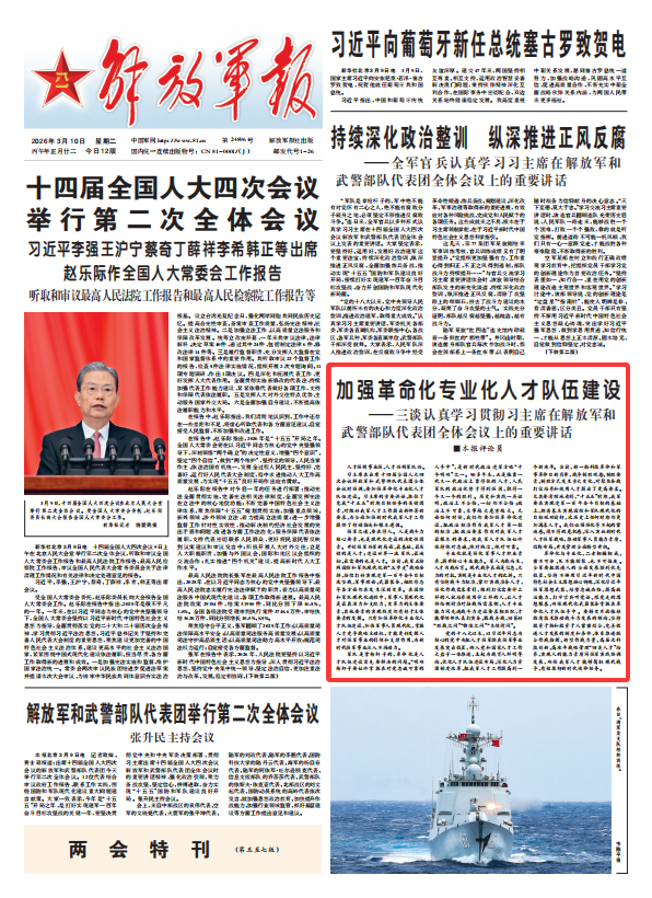 习主席在出席十四届全国人大四次会议解放军和武警部队代表团全体会议时强调,要加强革命化专业化人才队伍建设。习主席的重要讲话,抓住了完成“十五五”时期目标任务的关键因素,对做好我军人才工作提出新部署新要求,为全面加强新时代我军人才工作提供了行动指南和根本遵循。